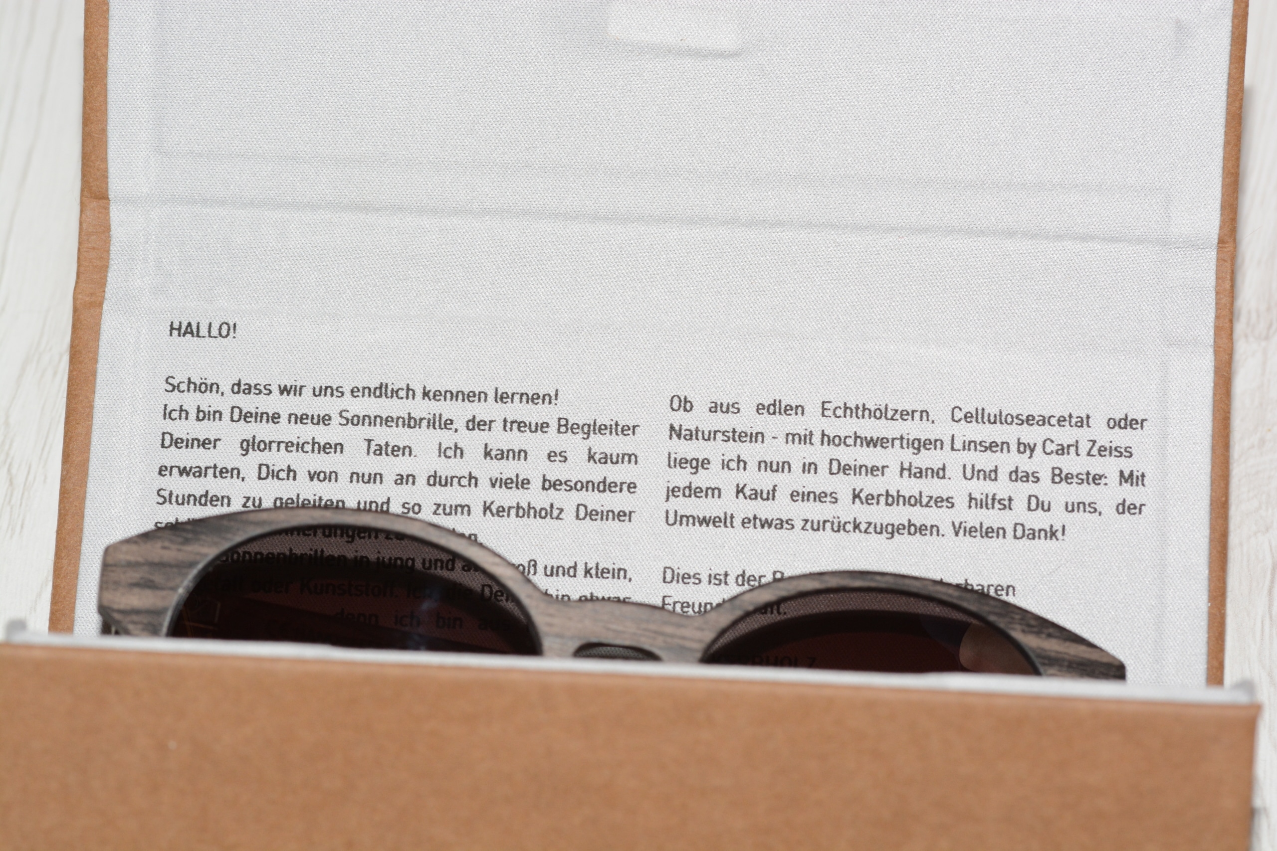 Die Sonnenbrillen von Kerbholz symbolisieren mit dem organischen Rohstoff Holz vor allem schöne Momente und Erlebnisse sowie bleibende Erinnerungen, die mit ihnen vor allem im Sommer während einer Reise oder eines Urlaubes erlebt werden. Als stylishes Accessoire wertet die Brille nicht nur das eigene modische Outfit auf, für jeden Kauf eines Modells pflanzt Kerbholz in Zusammenarbeit mit der Organisation „Prima-Klima e.V.“ einen Baum auf dem südamerikanischen Kontinent.
